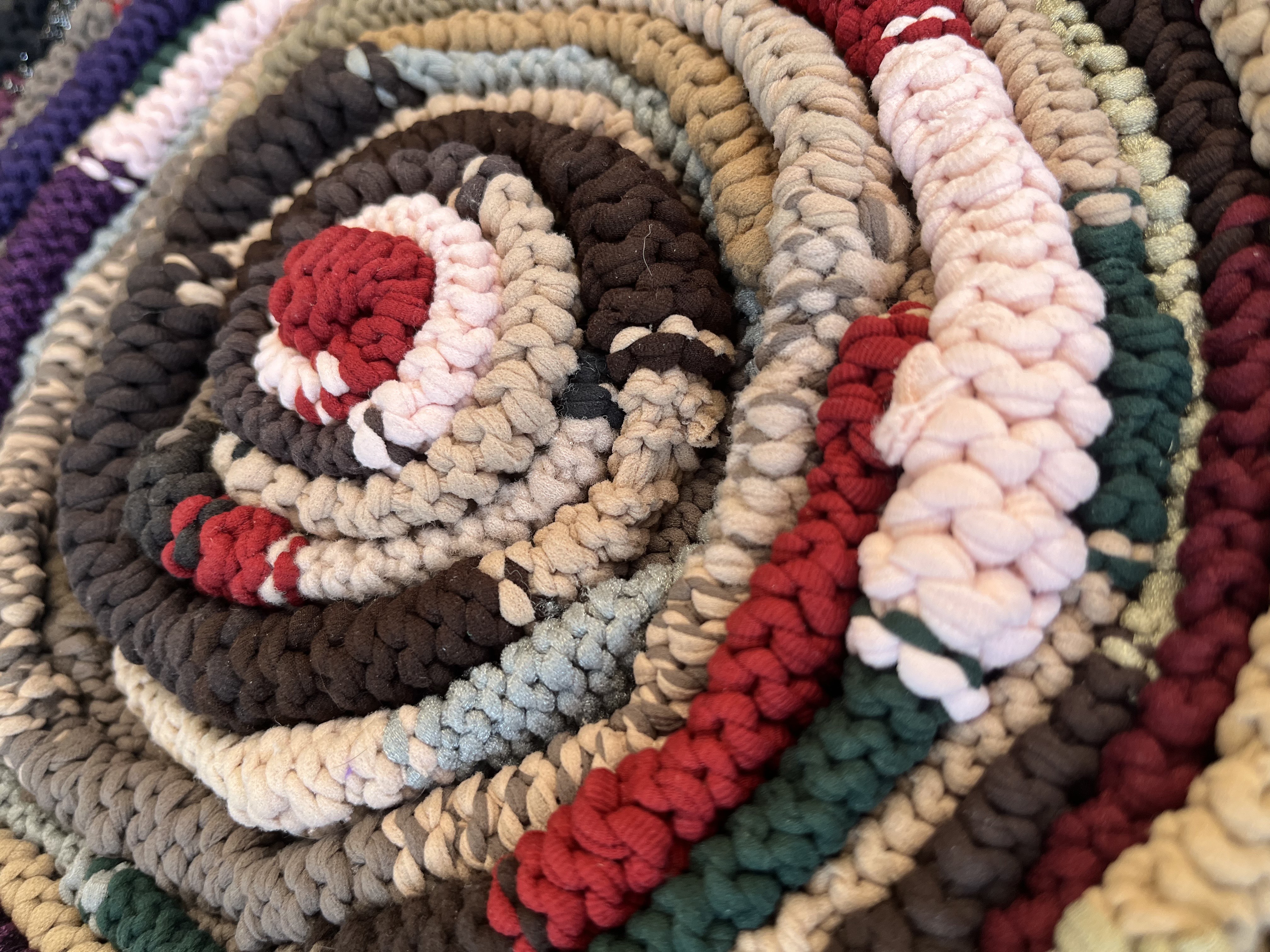This feminist inspired work utilises tights generously donated by local women and uses these intimate textile body items, with multiple associations from sexy to serviceable, to creatively explore political elements regarding women’s bodies and lives. The process of corresponding with, and often meeting the women who donated hosiery is a key element, these relational relationships stand in stark contrast to the transactional relationships which dominate contemporary culture, adding poignancy to this work. Many women demonstrated further interest, asking for information and/or photographs of work in progress and for notification upon completion with photographs of the final work. This continuing involvement was a surprising and appreciated additional aspect in developing this work.